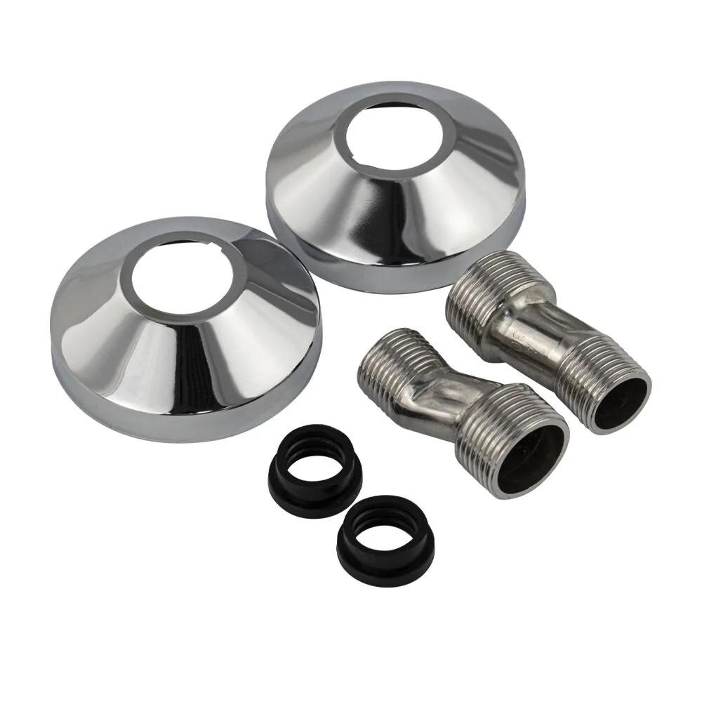 Комплект из нержавеющей стали: 2 эксцентрика + 2 чашки. Укомплектованные декоративными хромированными чашками резьбовые эксцентрики, обеспечивают беспроблемное подключение к водопроводу сантехнических смесителей. Применение изделий дает возможность компенсировать неточности при размещении водорозеток либо резьбовых патрубков стального водопровода, скорректировать положение смесителя в пространстве. Материалом фитинга является высокопрочная антикорозийная нержавеющая сталь марки SUS 304. Гальванопокрытие соединителей – никелевое, чашек – хромовое. Высота эксцентрика мм, чашка мм.